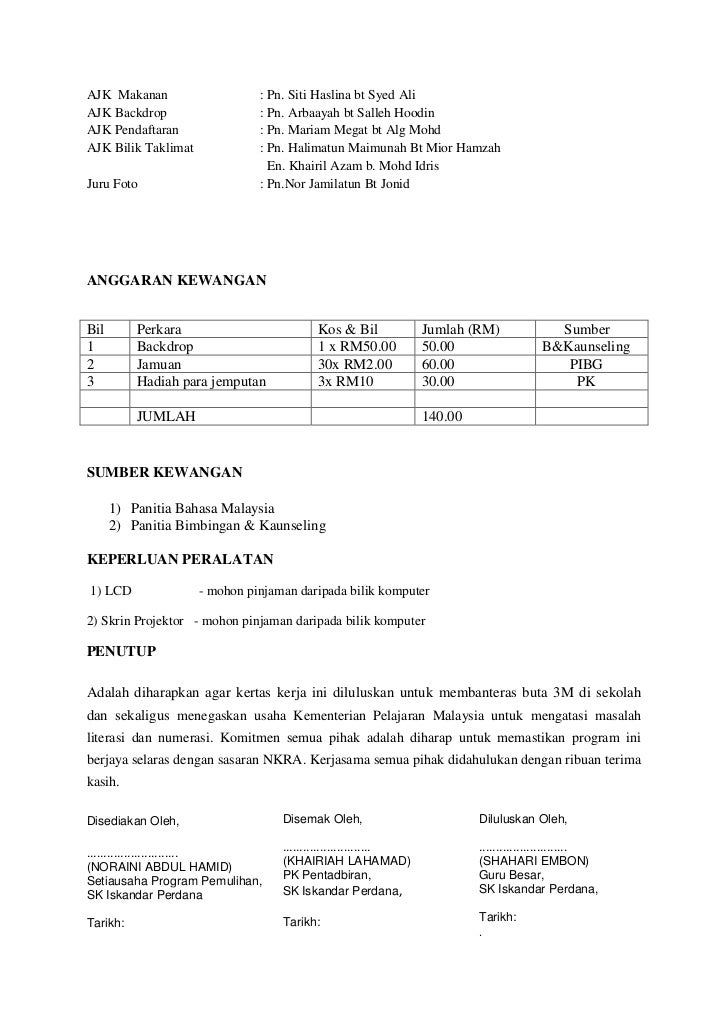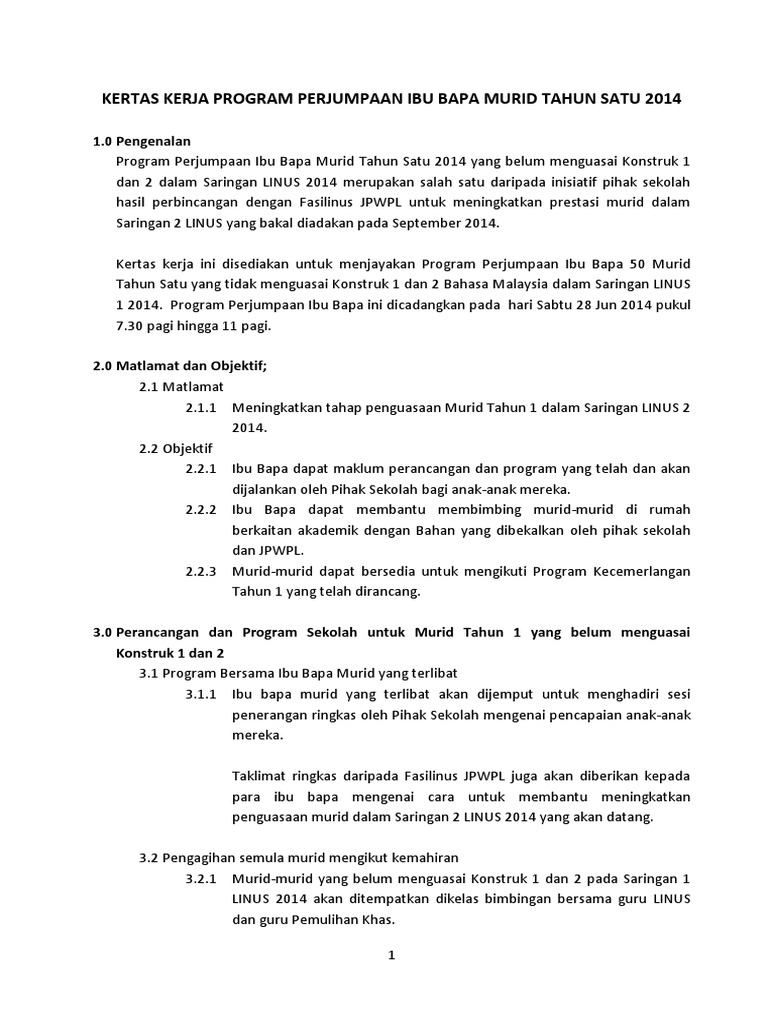 Contoh Kertas Kerja Program Perjumpaan Ibu Bapa Murid Tahun Satu Kelas Pemulihan Khas
