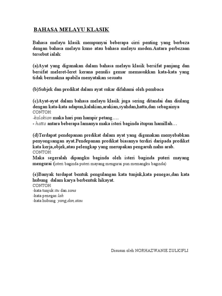 Karya sastra melayu klasik pengertian ciri jenis unsur contoh untuk pembahasan kali ini kami akan mengulas mengenai karya sastra melayu klasik yang dimana dalam hal ini meliputi pengertian ciri jenis unsur dan contoh untuk lebih memahami dan mengerti simak ulasan dibawah ini. Bahasa klasik ini lebih jelas berbanding dengan bahasa kuno. Penggunaan kata pemeri adalah dalam ayat ayat berikut dianggap menyalahi tatabahasa bahasa melayu.