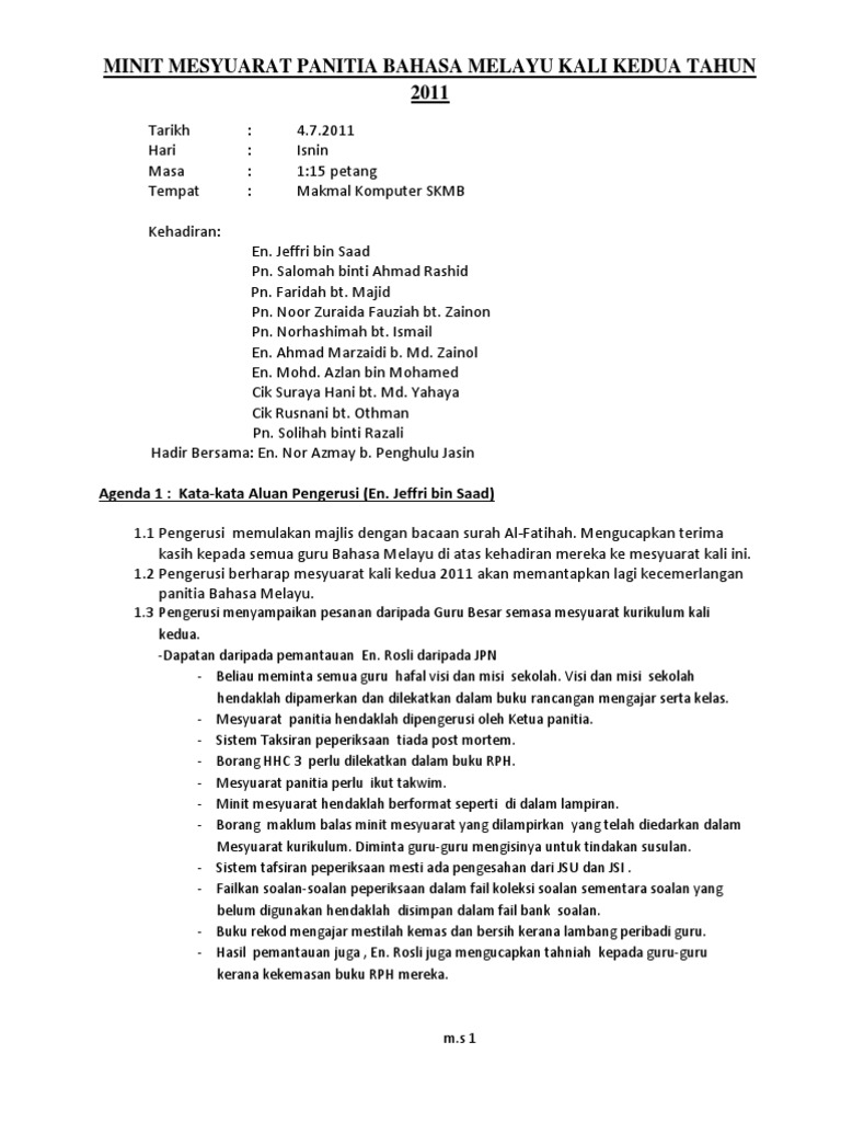 Contoh Minit Mesyuarat Panitia Bm Kali Pertama