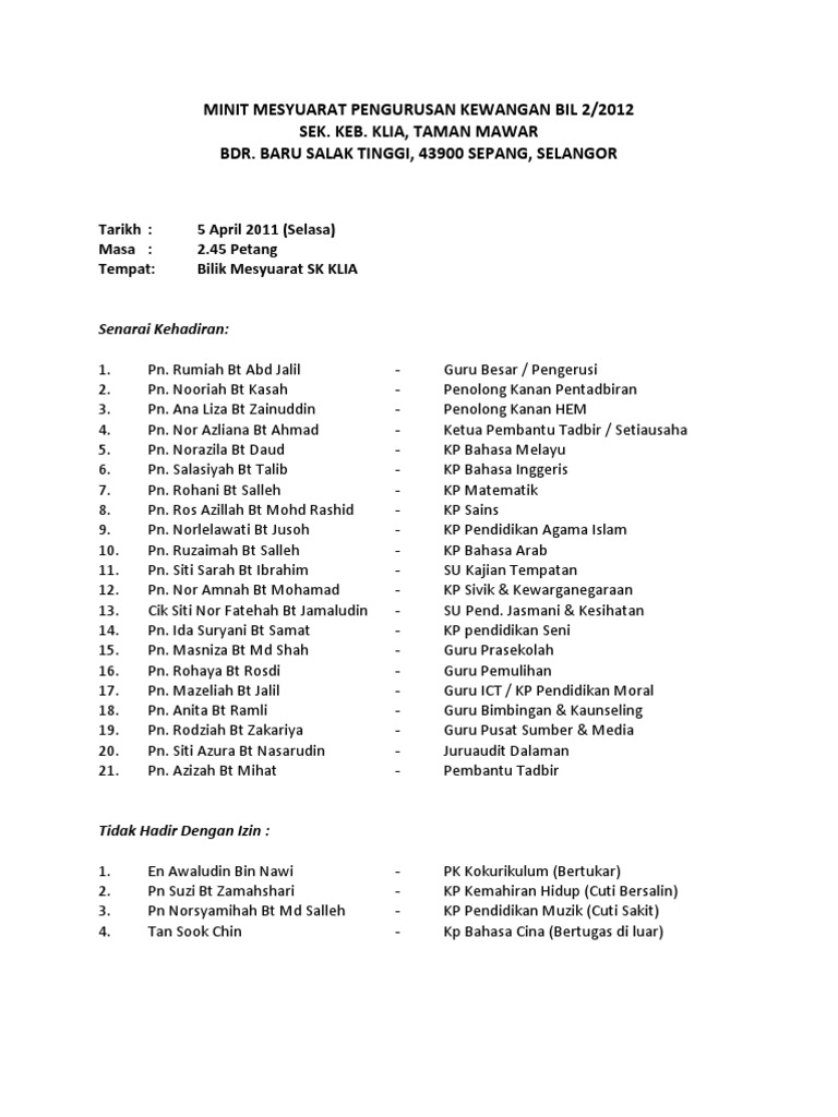 Contoh Minit Mesyuarat Kewangan Sekolah Doc