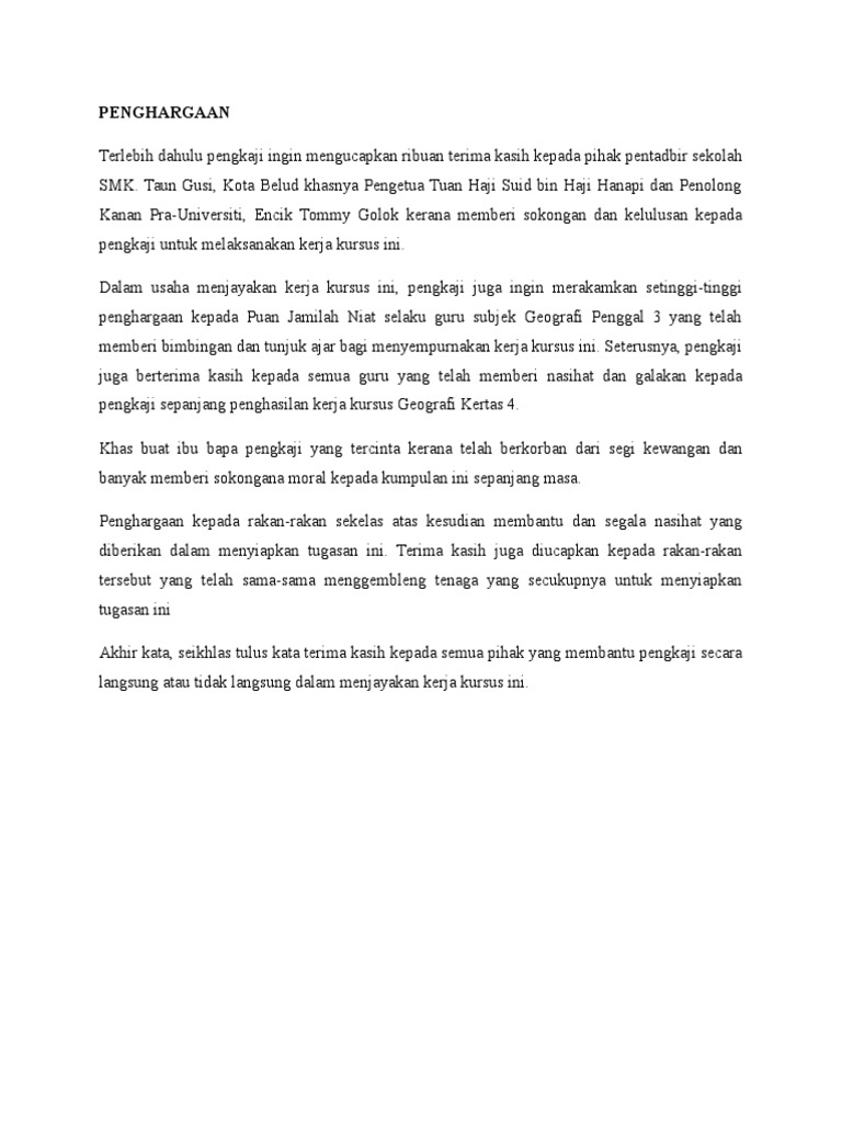 Kerja Kursus Geografi Tingkatan 2 Penghargaan