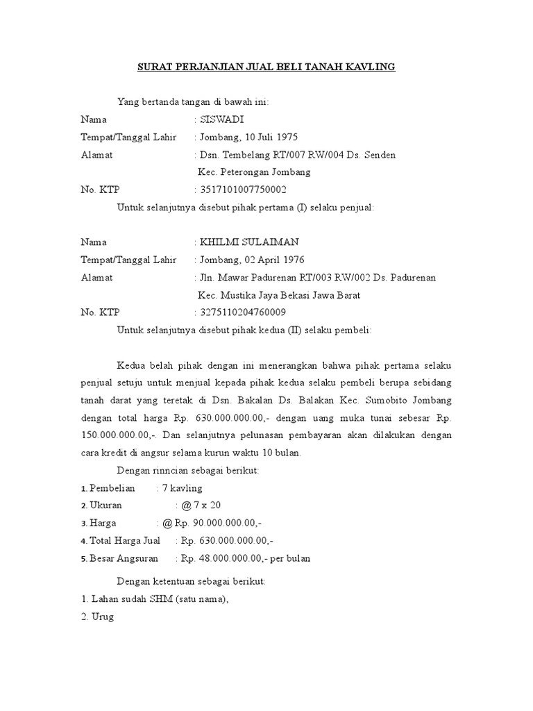 Surat Perjanjian Jual Beli Kredit Tanah Lokasi Kavlingan Docx Google Drive