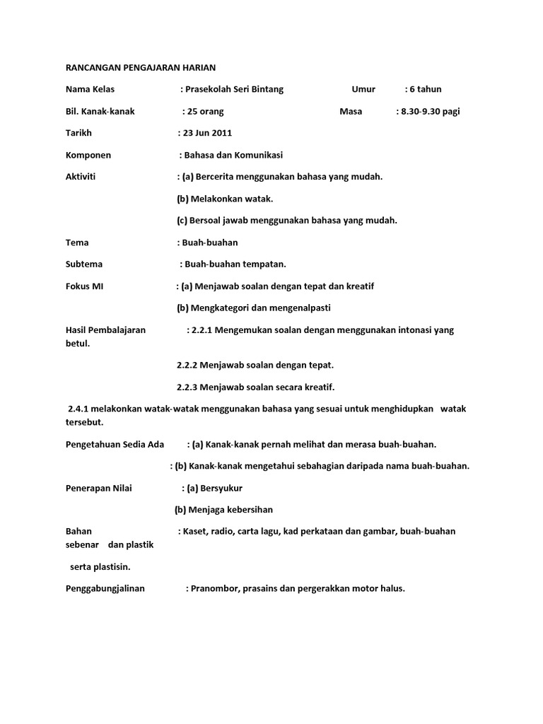 Contoh rancangan pengajaran harian prasekolah tema buah buahan. 40 minit 0830 0910 bilangan kanak kanak. Muzik august 03 2018 pendidikan perkembangan kanak kanak. Mengenal buah buahan prasekolah contoh rancangan pengajaran harian.