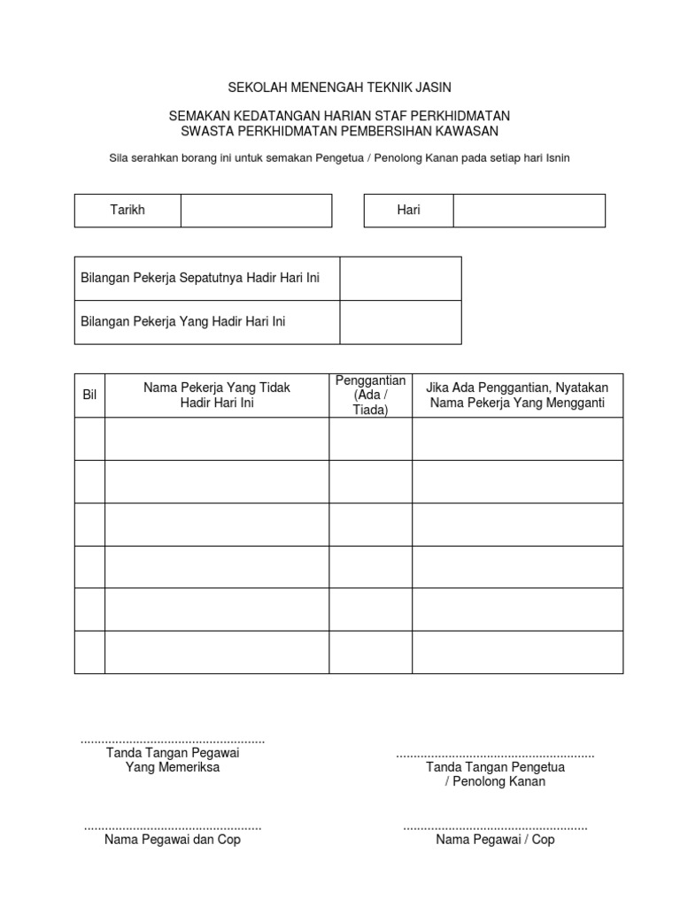 Borang Semakan Kehadiran Harian Pekerja Pembersihan Kawasan Di Sekolah