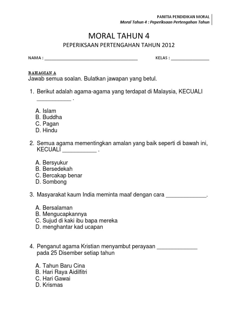 Jom Download Soalan Peperiksaan Awal Tahun Pendidikan Moral Tahun 4 Yang Bernilai Khas Untuk Ibubapa Lihat Cikgu Ayu