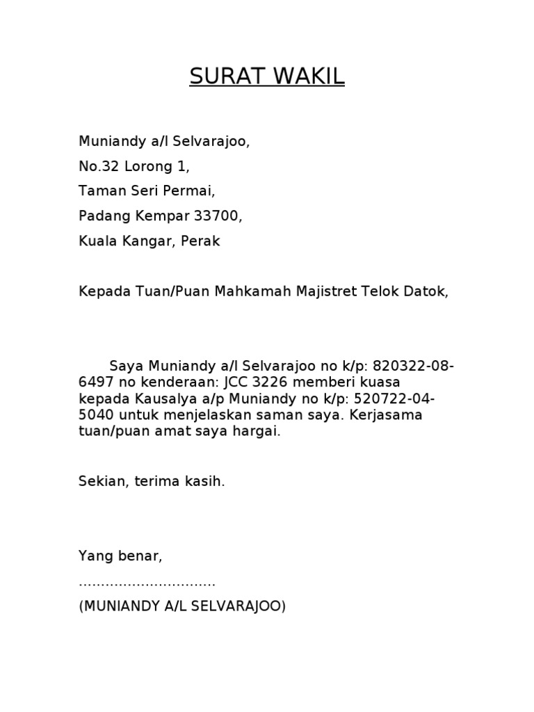 Contoh Surat Kuasa Wakil
