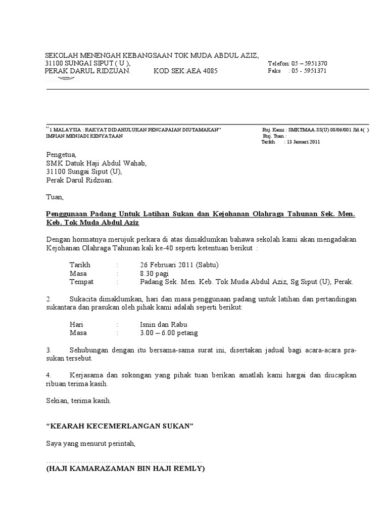 Contoh Surat Memohon Kebenaran Menggunakan Padang Sekolah