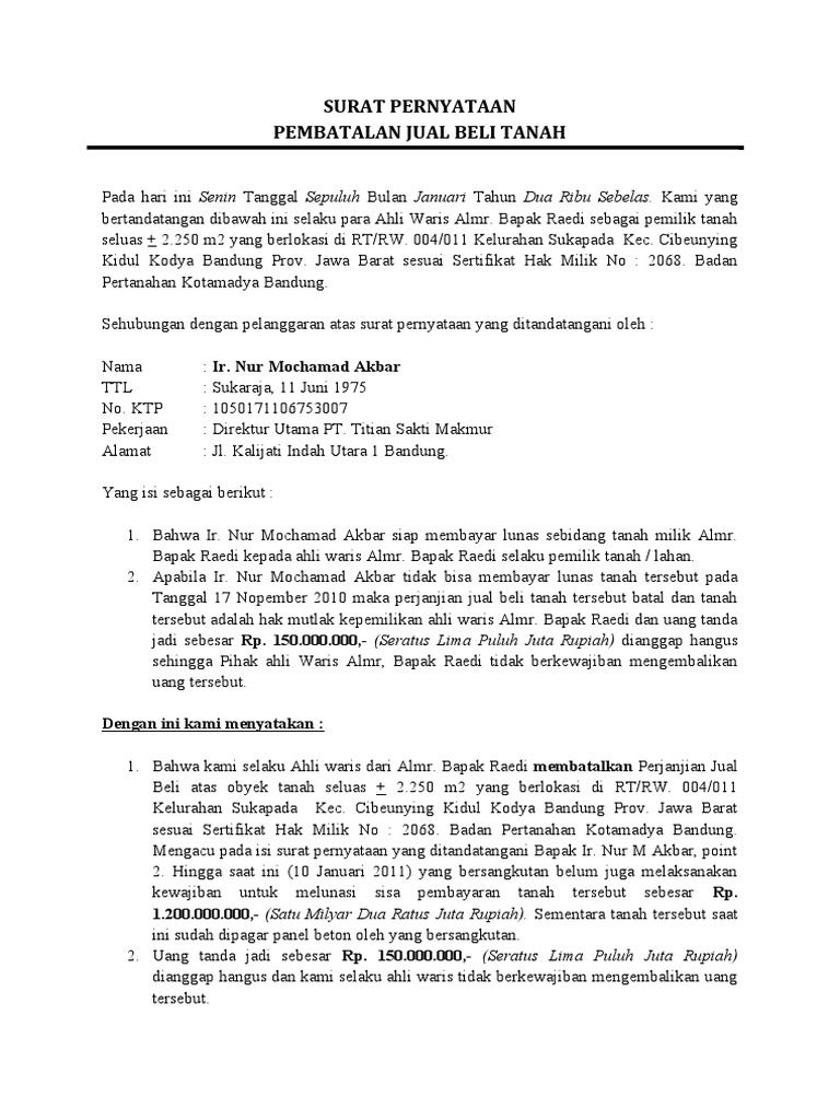 Contoh Surat Pembatalan Jual Beli Tanah Pdf