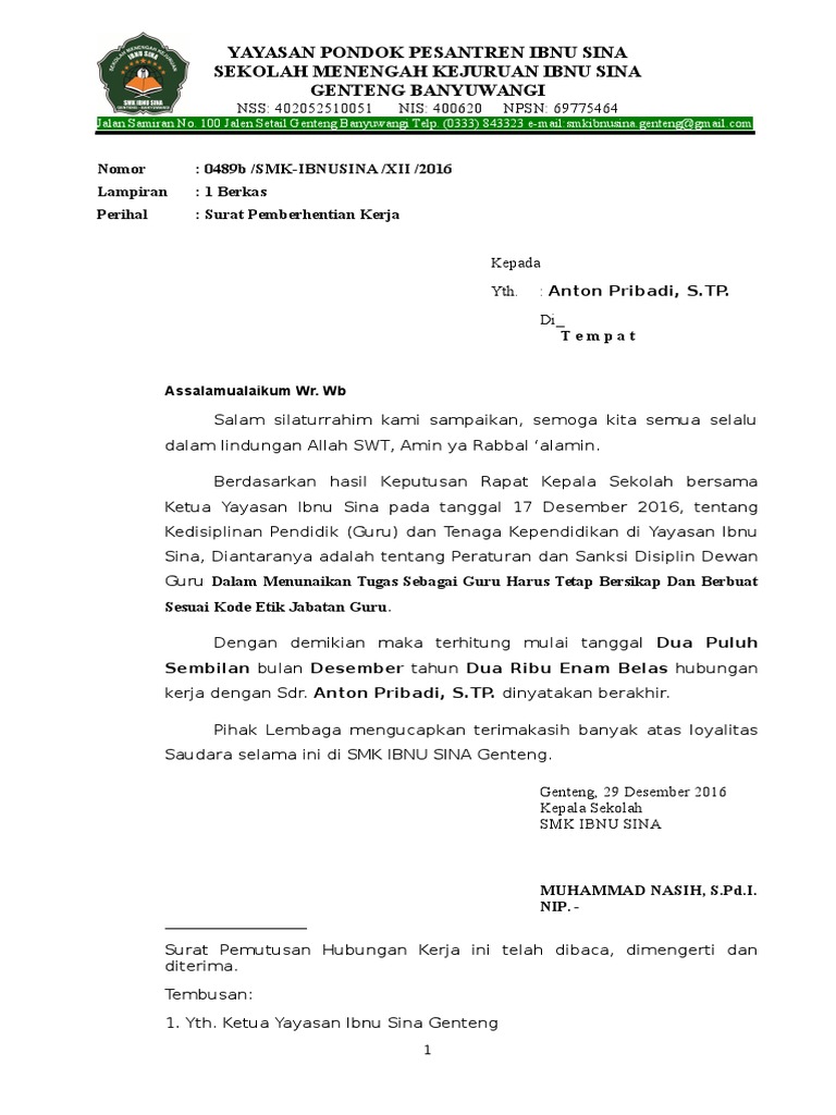 Contoh Surat Pemberhentian Kerja Guru Dari Kepala Sekolah Contoh Seputar Surat