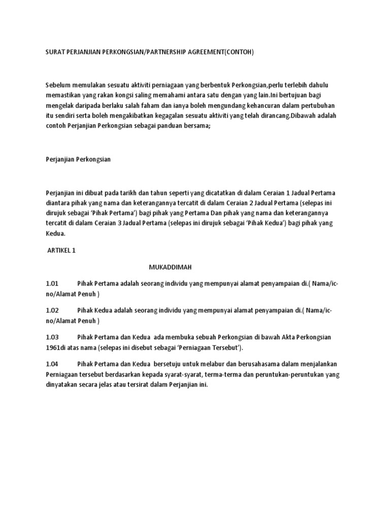 Contoh Surat Perjanjian Perkongsian Perniagaan Pdf Gawe Cv
