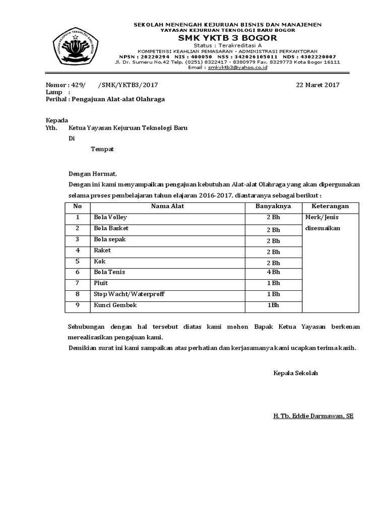 Surat Pengajuan Alat Olahraga 2017