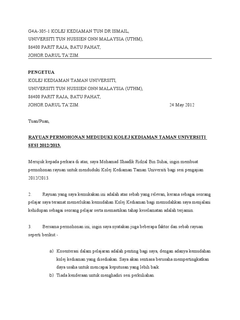 Contoh Surat Permohonan Asrama