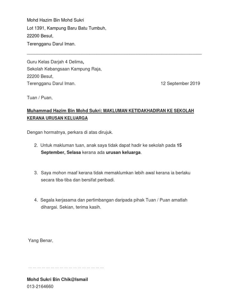 Surat Rasmi Tidak Hadir Ke Sekolah Atas Urusan Keluarga Dan Sebagainya