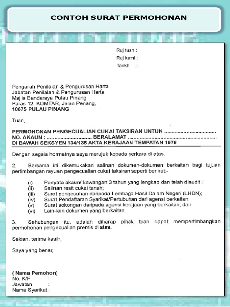 1 Peruntukan Pengecualian Cukai 3 Pertimbangan Pengecualian Contoh Surat Permohonan