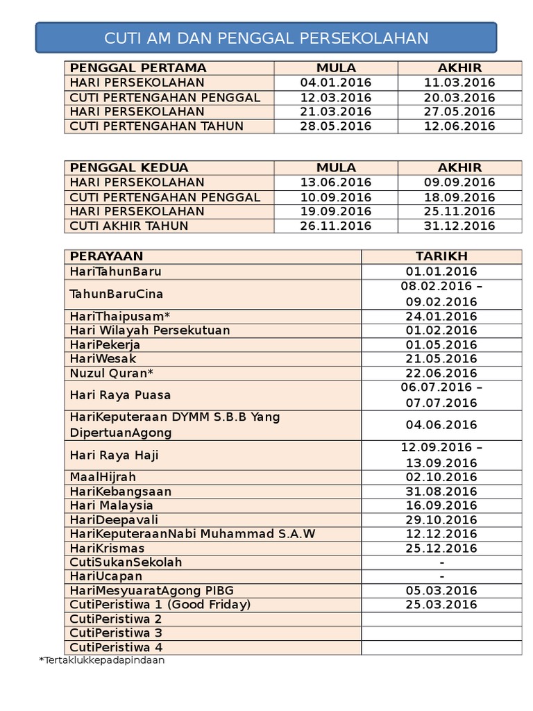 Kalendar Cuti Umum Dan Cuti Sekolah 2016