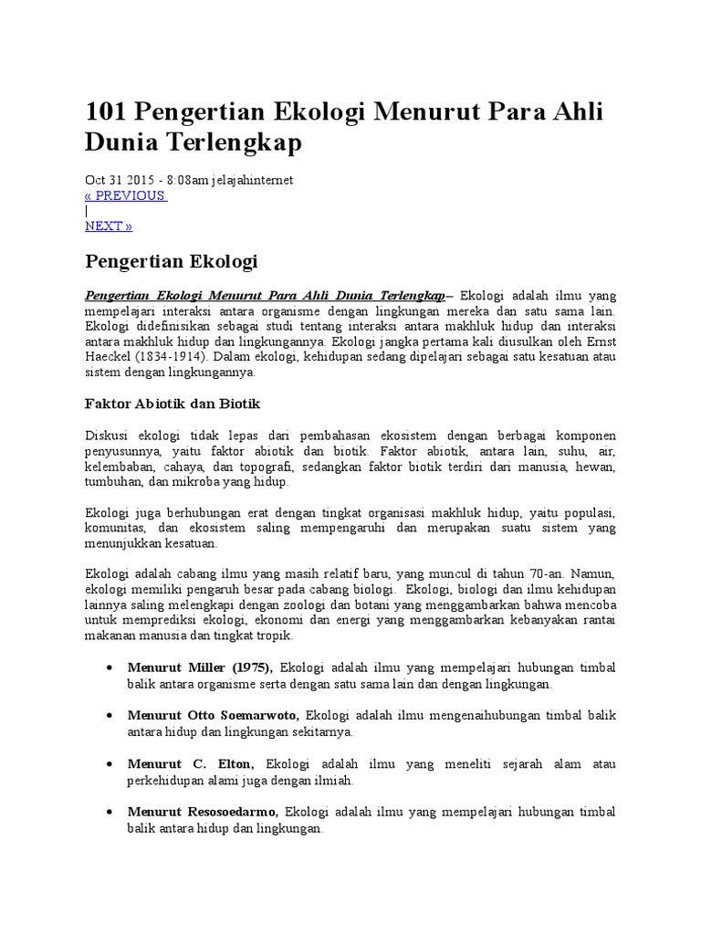 Definisi ini adalah definisi yang diterima dalam pengajian sains alam sekitar yang hanya terbatas kepada fenomena fizikal sesuai dengan pandangan semesta moden yang berteraskan kepada metode emperikal. Ekologi merupakan cabang ilmu yang masih relatif baru yang baru muncul pada tahun 70 an. Istilah ekologi pertama kali dikemukakan oleh ernst haeckel 1834 1914.
