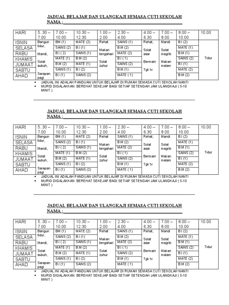 Jadual Belajar Dan Ulangkaji Semasa Cuti Sekolah