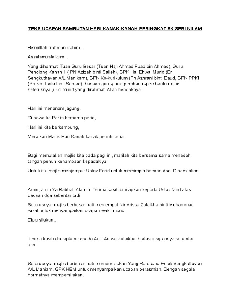 Teks Ucapan Sambutan Hari Kanak