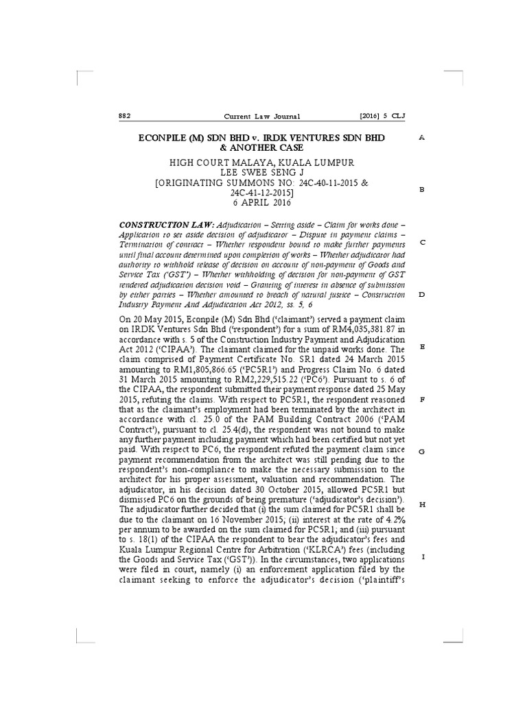 Econpile M Sdn Bhd V Irdk Ventures Sdn Bhd Another Case Adjudication Bill Law