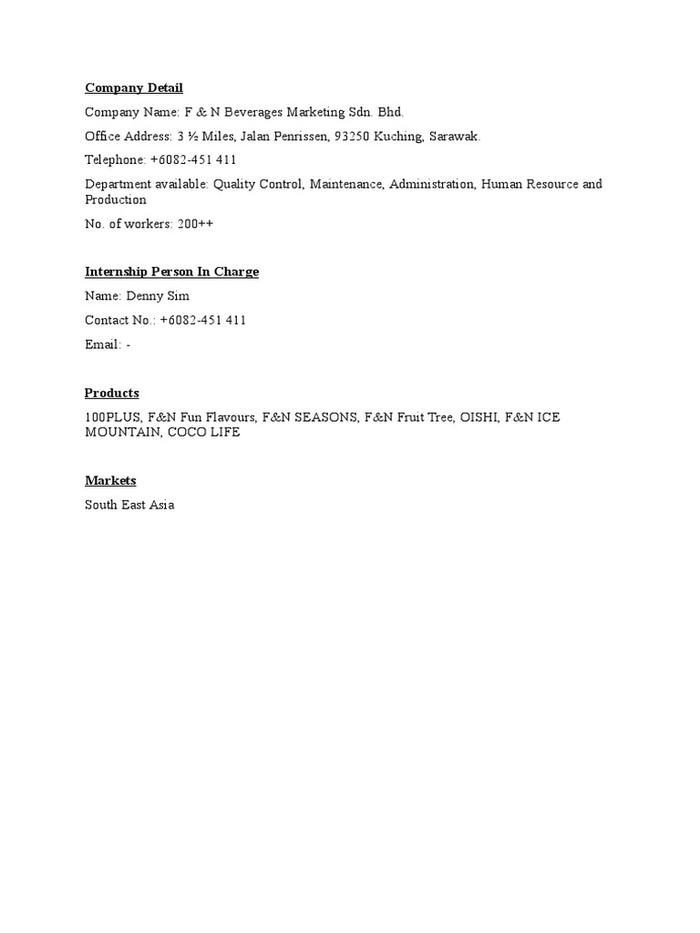 Company Details F N Beverages Marketing Sdn Bhd Business Nature