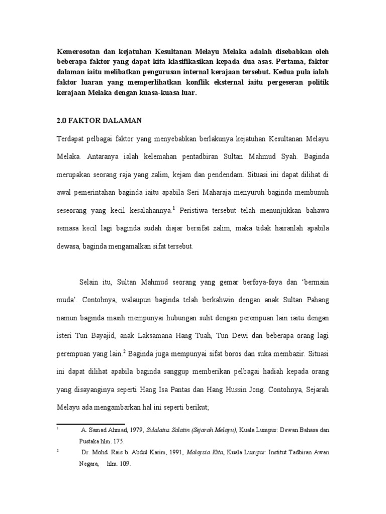 Isi Kandungan Mukasurat 1 Pendahuluan 2 2 Faktor Faktor Yang Menyumbang Kejatuhan Kesultanan Melaka 3 Hingga 6 3 Pengajaran Daripada Daripada Kejatuhan Melaka 7 Hingga 8 Chell Mn Academia Edu