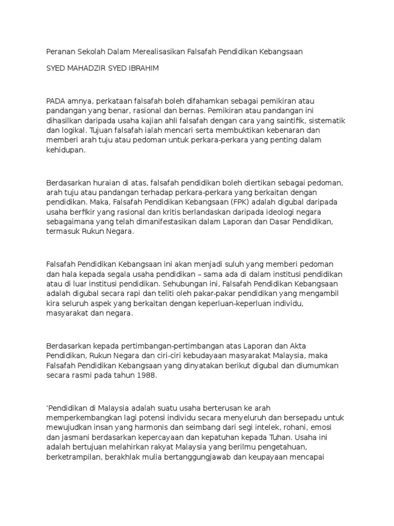 Peranan Sekolah Dalam Merealisasikan Falsafah Pendidikan Kebangsaan