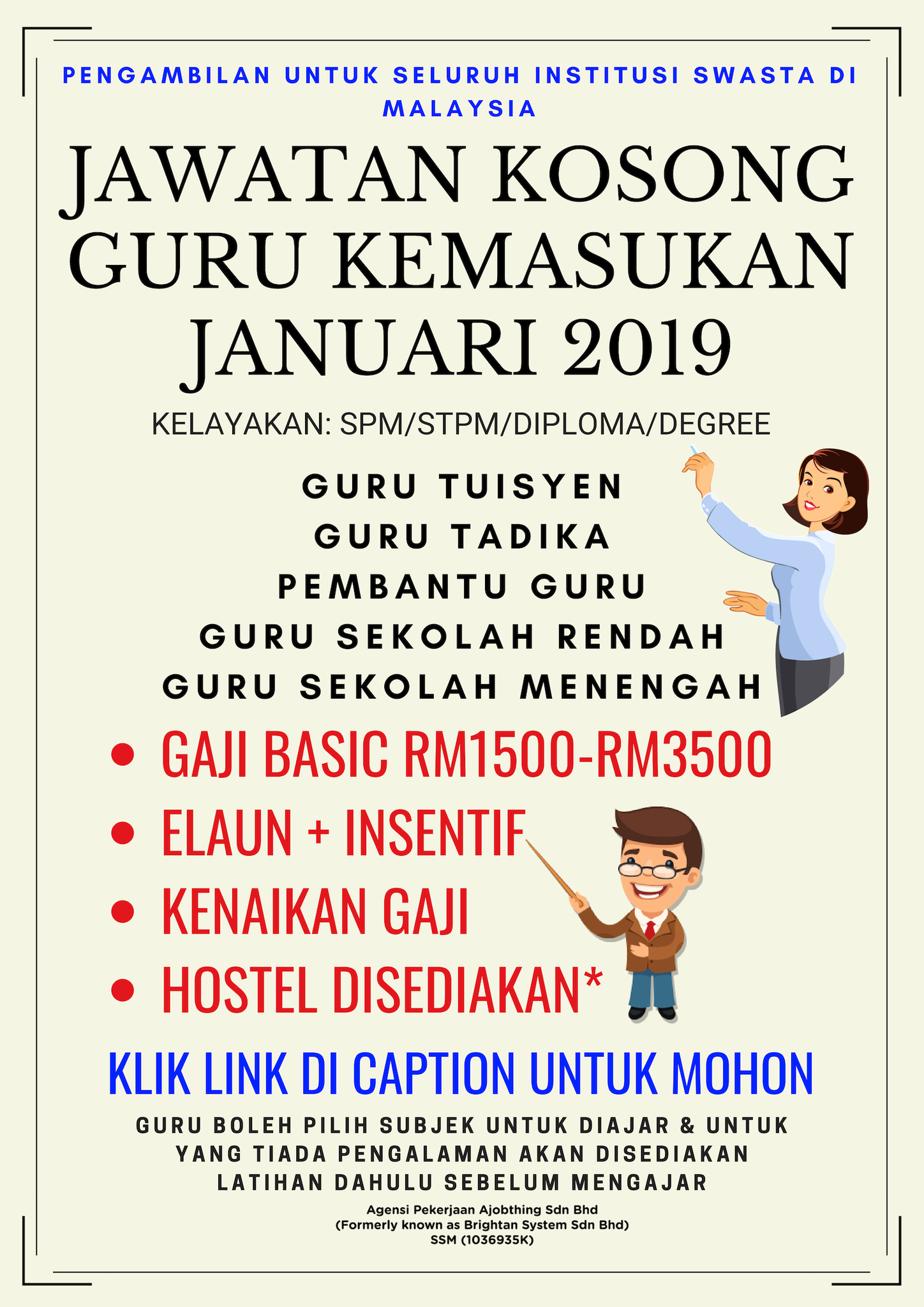 Maukerja در توییتر Jawatan Kosong Guru Januari 2019 Intake Pengambilan Untuk Seluruh Institusi Swasta Di Malaysia Gaji Basic Rm1500 Rm3500 Kelayakan Spm Stpm Diploma Degree Guru Intake Jan 2019 Gaji Basic Minimum Rm1500 Https T Co E52vgsl2zp